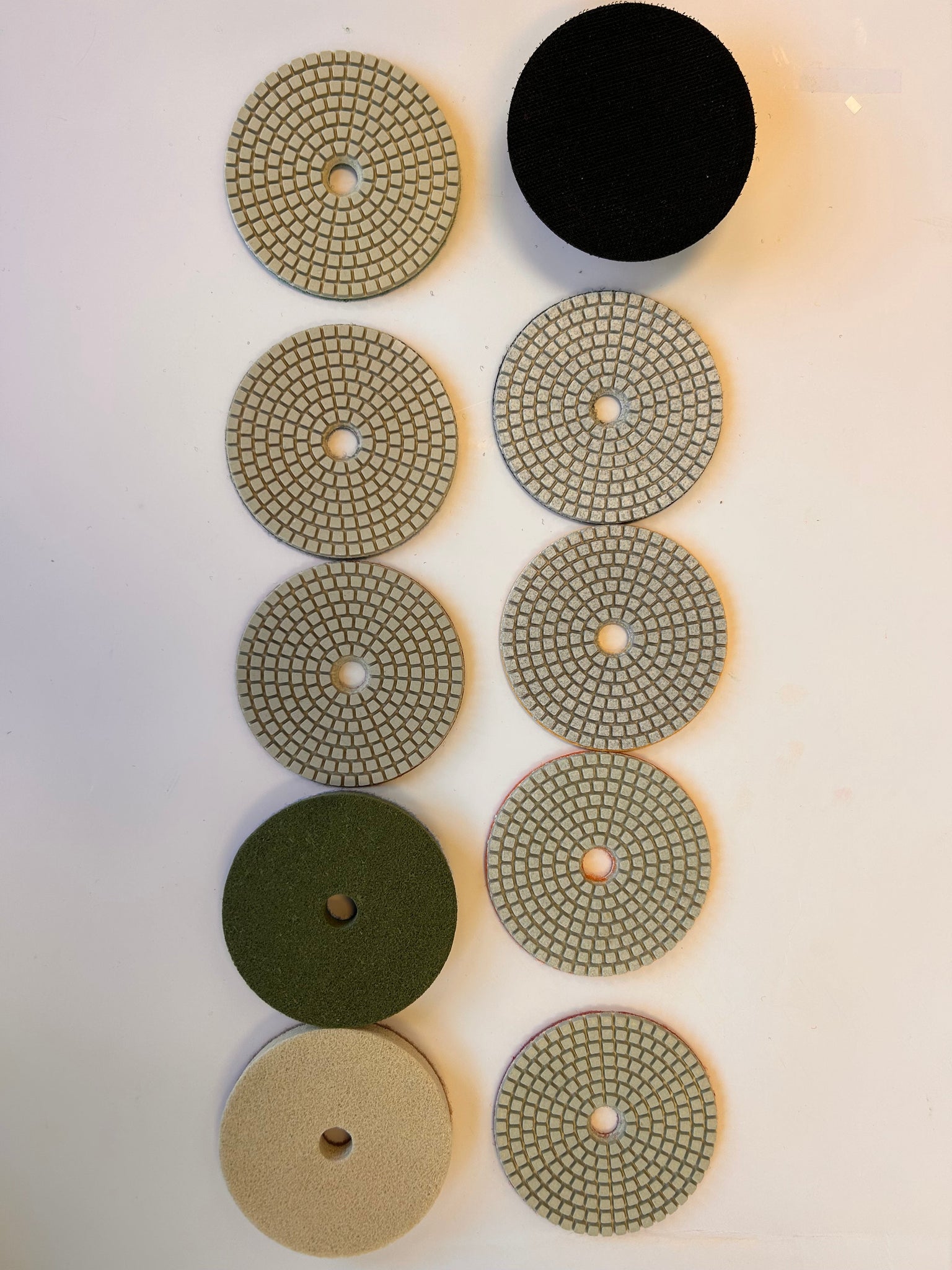 A reasonably priced set of diamond discs for polishing stone and stone like countertops and tiles. includes a backer pad that fits 5/8" standard polishers or grinders, and has an adaptor for drill attachment. 4"